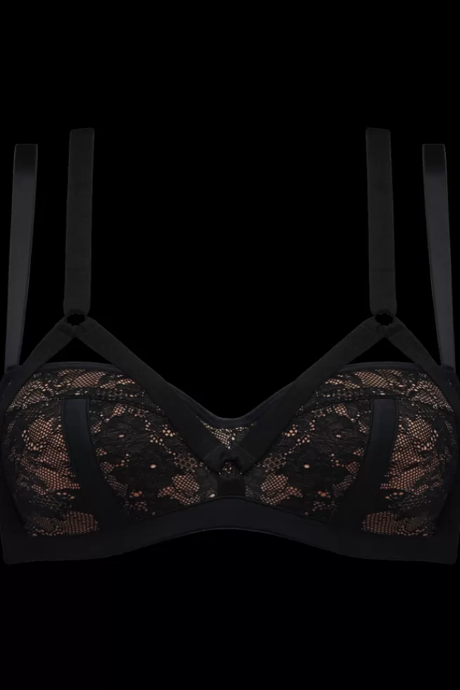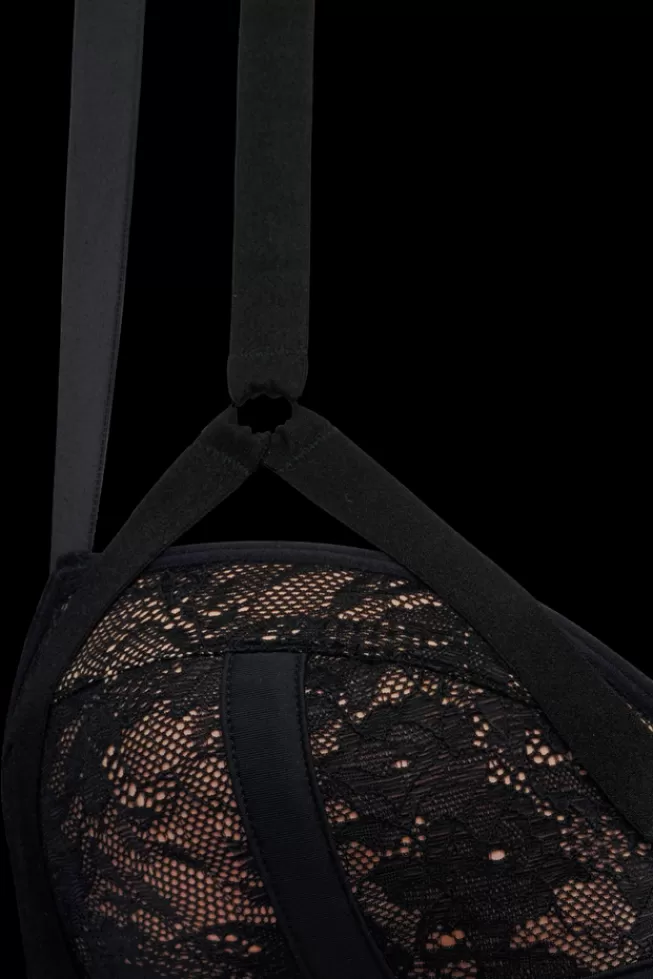 This balcony bra has a comfortable fit that suits all types of breast. The bra creates a subtle, yet sensual cleavage. It is crafted from recycled fabric in a sandy color. The sand colored base is overlaid with black floral lace made from recycled yarn. Bold black straps are added to frame your décolleté. The straps cross in the back to finish the design and create a sensual feeling.
